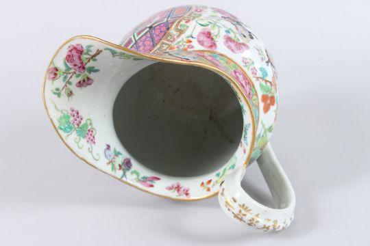 A 19TH CENTURY CHINESE CANTON PORCELAIN JUG, painted with a panel of figures in an interior, the body painted with flowers, butterflies and insects.