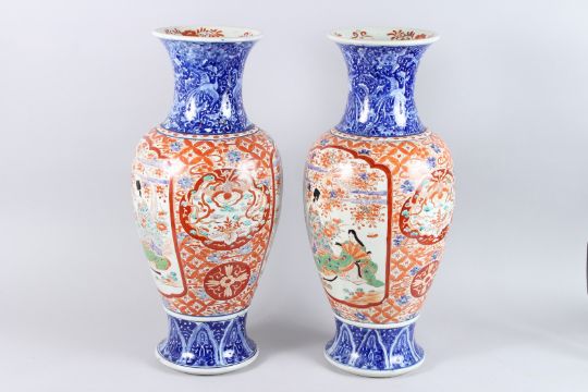 A LARGE PAIR OF IMARI VASES, red and blue with panels of figures and motifs.