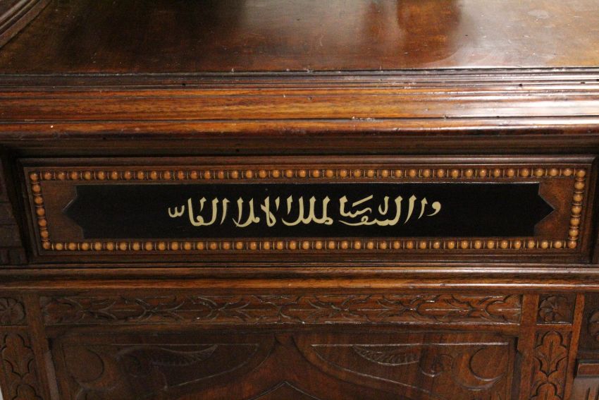 AN IMPRESSIVE ITALIAN OR EGYPTIAN MOTHER-OF-PEARL INLAID HARDWOOD ORIENTAL CUPBOARD in the style of GUISEPPE PARVIS.