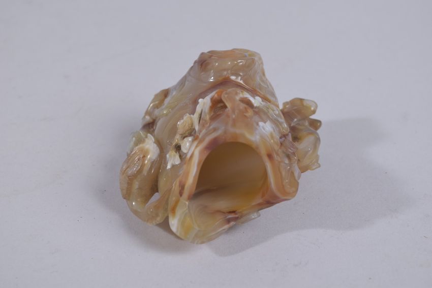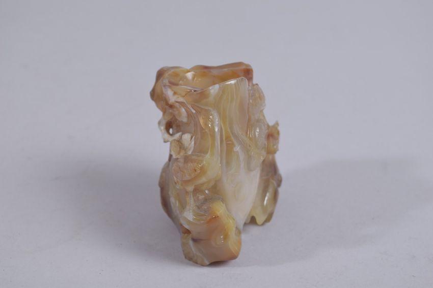 A FINE CHINESE NATURALISTIC CARVED JADE BRUSH WASHER VASE, with relief deer and crane and foliate designs, 8.5cm high.
