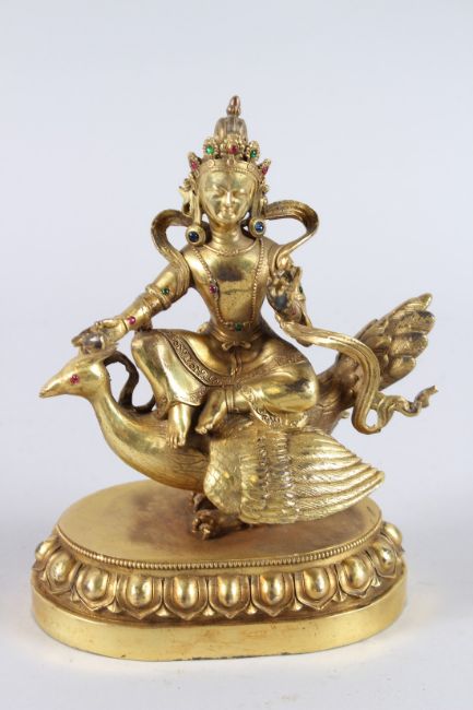 A CHINESE GILDED BRONZE FIGURE OF A FEMALE DEITY, seated on a phoenix and lotus base.