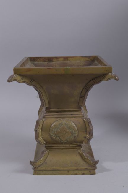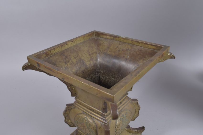 A LARGE CHINESE OR JAPANESE BRONZE SQUARE FORM VASE, with character inscription to foot, 30cms high.
