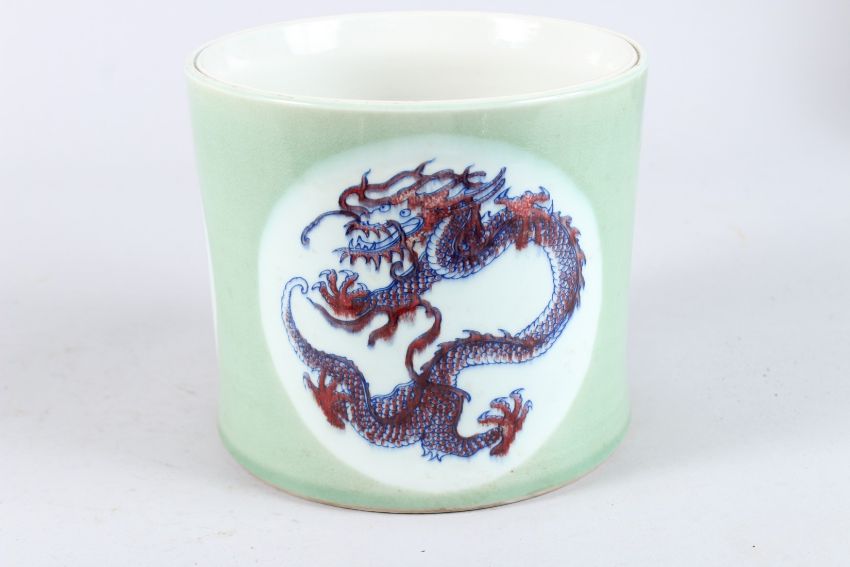 A GOOD CHINESE GREEN, BLUE AND WHITE BRUSH POT with three panels of dragons.