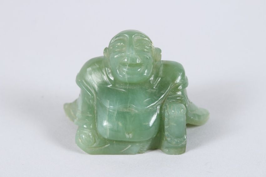 A CHINESE CARVED JADE SEATED BUDDHA.