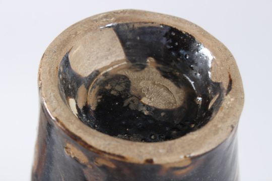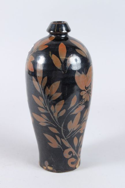 A CHINESE POTTERY VASE, dark brown glaze painted with leaves.