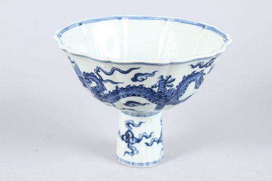 A GOOD CHINESE PETAL SHAPED BLUE AND WHITE STEM CUP.