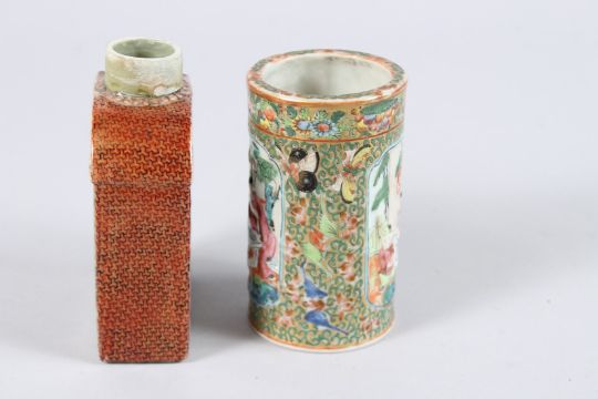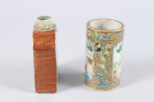 AN 18TH CENTURY CHINESE FAMILLE ROSE TEA CADDY with panels of figures, 4.5ins high, and a Canton spill vase, 4.5ins high.