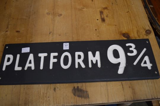 A novelty carved wood and painted sign 'Platform 9¾'.