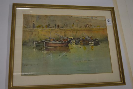 Alasdair MacMillain, moored fishing boats at a harbour wall, watercolour.