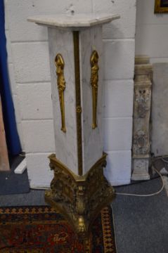A decorative marble and ormolu triangular form pedestal column.
