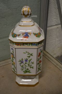 A Continental porcelain vase and cover painted with panels of flowers and Oriental figure subjects.