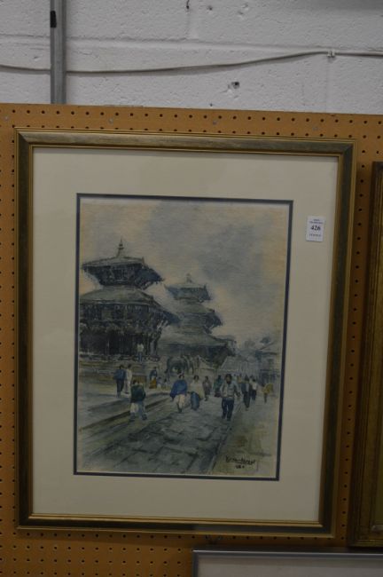 Busy street scene in Katmandhu, watercolour.