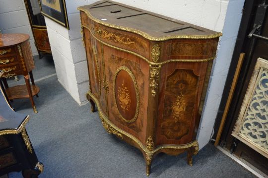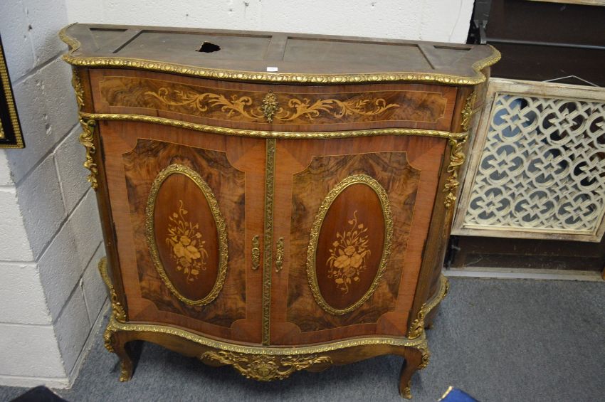 A French ormolu mounted walnut and marquetry serpentine fronted two door cabinet (lacking marble top).