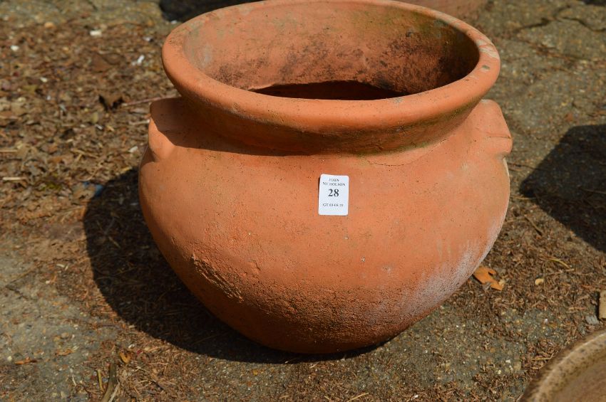 A twin handled terracotta plant pot.