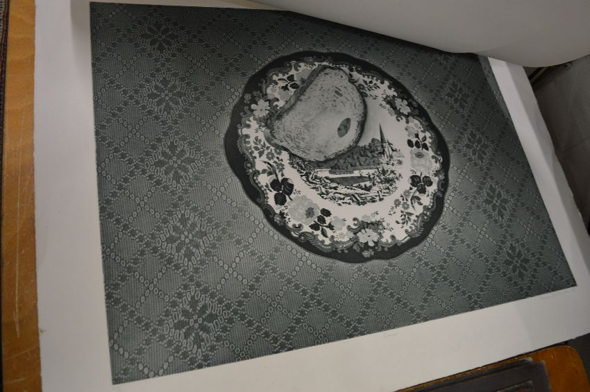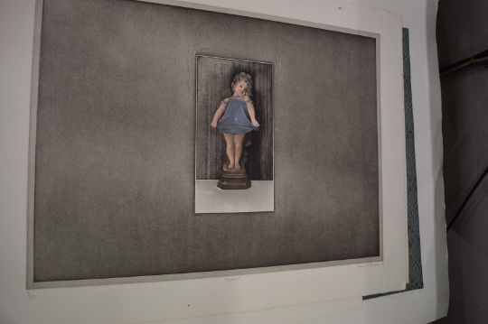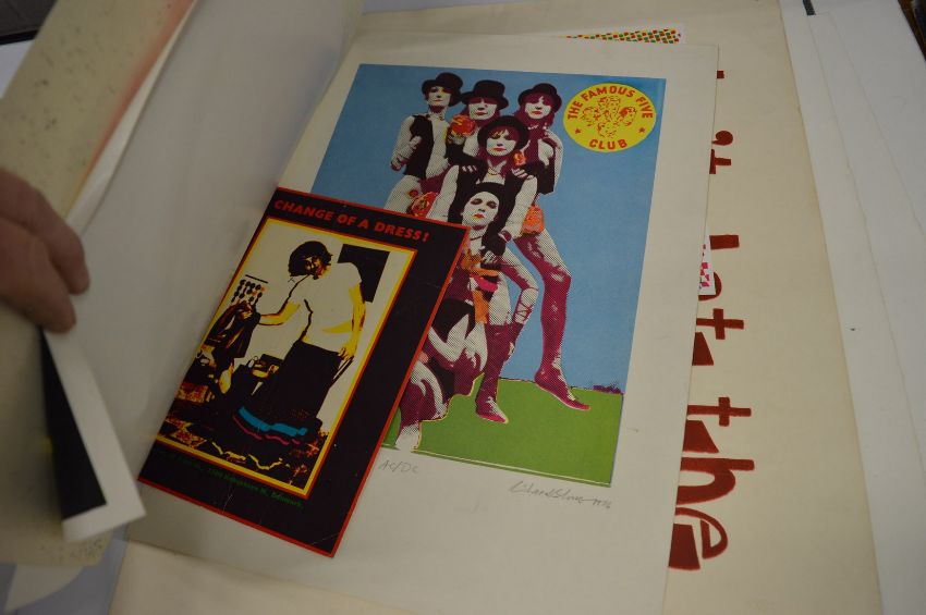 A collection of pop art prints and posters together with a group of etchings and prints, all unframed in two folders.