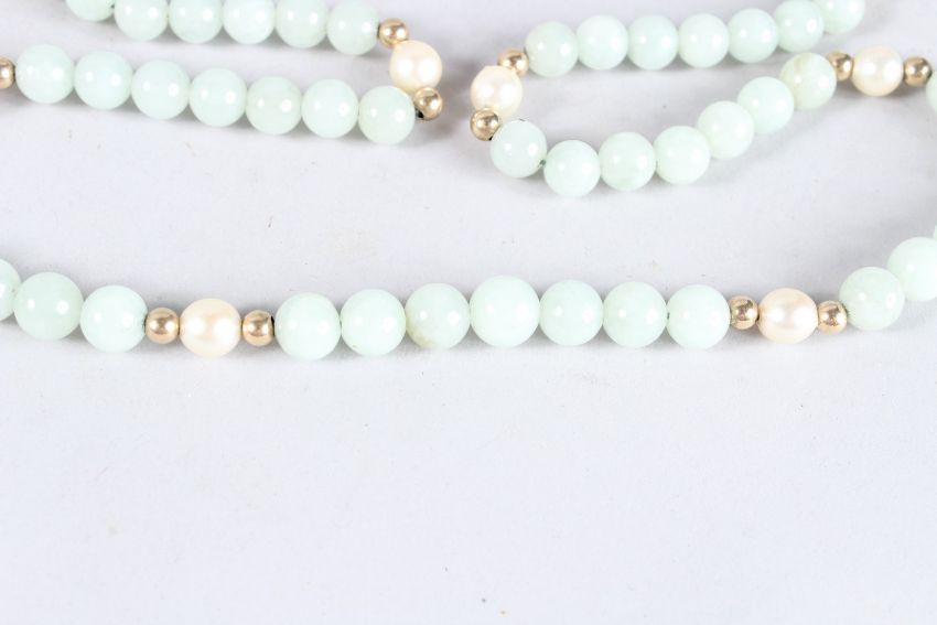 A VERY GOOD STRING OF JADE AND PEARLS with a 9ct gold clasp.