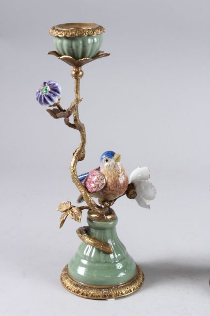 A PAIR OF BIRD AND FLOWER PORCELAIN AND GILT METAL CANDLESTICKS on circular bases.