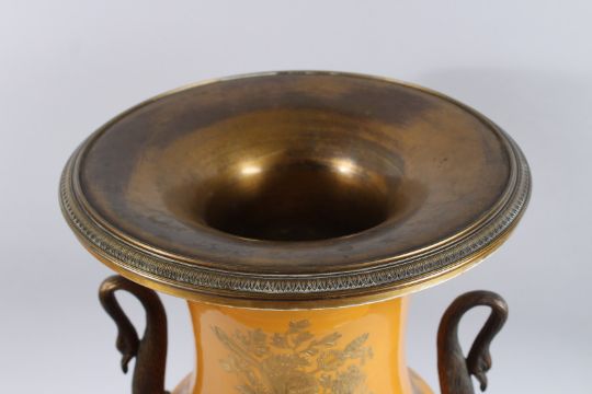 A LARGE SEVRES PORCELAIN YELLOW GROUND VASE painted with a scene of Napoleon on horseback, gilt decoration, bronze swan handles on a bronze base with four claw feet.