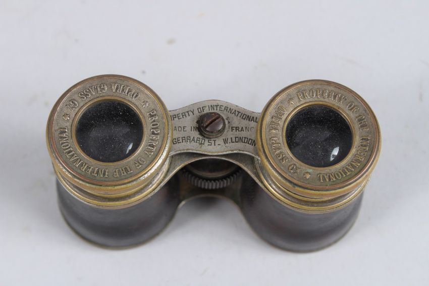 A PAIR OF LEATHER AND METAL OPERA GLASSES in a leather case.