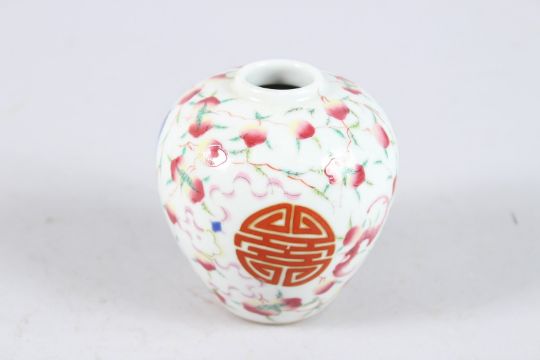 A SMALL CHINESE BULBOUS VASE painted with bats and peaches.