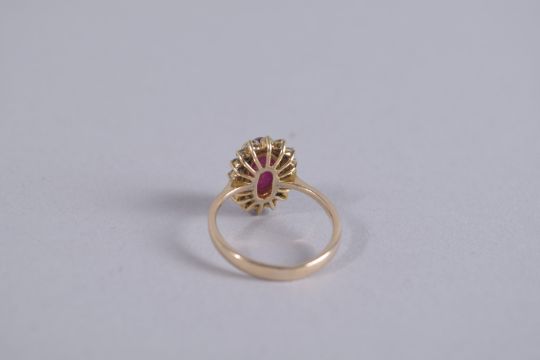 A RUBY AND DIAMOND CLUSTER RING, cabochon (Burmese) non-treated ruby 2.7ct set 0.4ct diamonds in 18k gold mount + certificate.