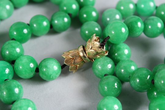 A GOOD STRING OF LARGE JADE BEADS with 14ct gold clasp.