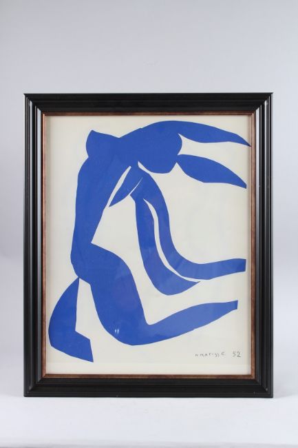 A SET OF FOUR HENRI MATISSE STYLE BLUE AND WHITE PICTURES.