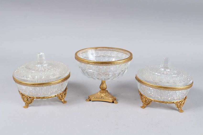 A PAIR OF CUT GLASS CIRCULAR BOWLS AND COVERS, 6ins diameter, and a comport, 6ins diameter (3).