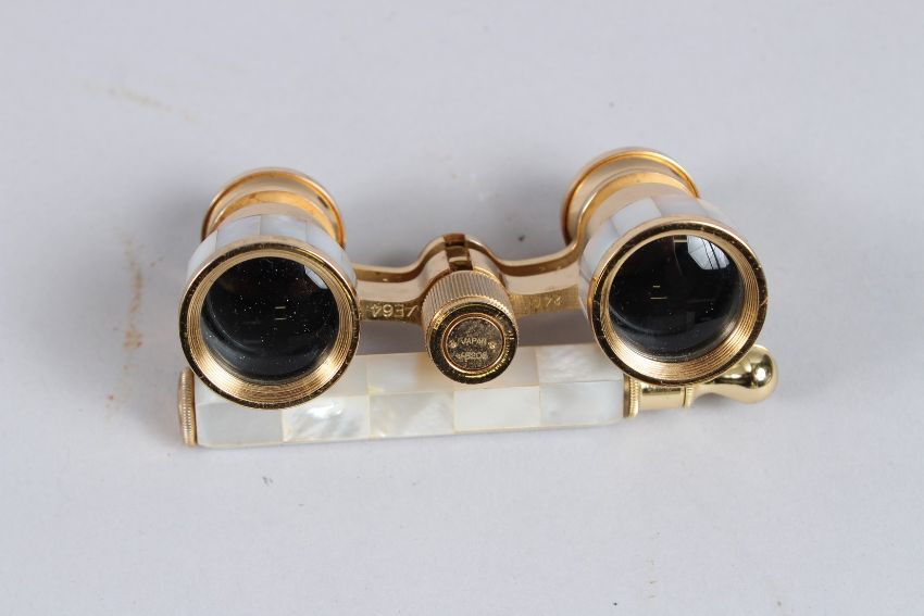 A GOOD PAIR OF CARLTON MOTHER-OF-PEARL OPERA GLASSES with handle, in a case.