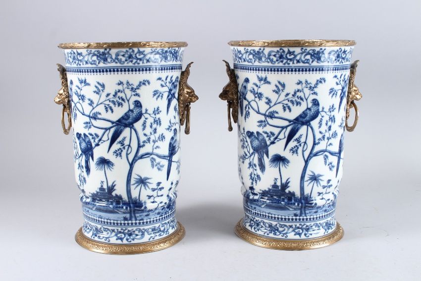 A GOOD PAIR OF BLUE AND WHITE PORCELAIN VASES decorated with parrots, with gilt metal handles and bases.