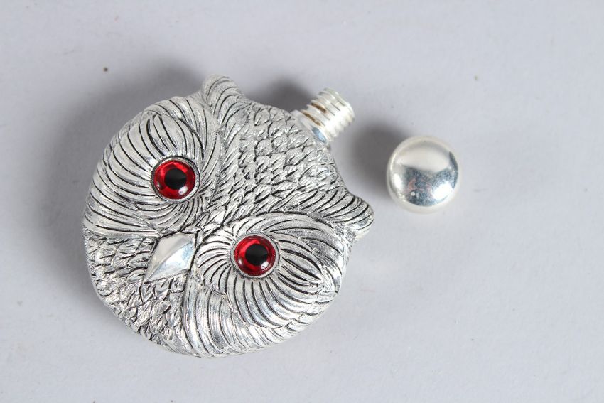 A SILVER PLATED NOVELTY OWL FACE PERFUME BOTTLE.