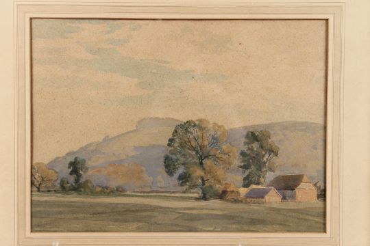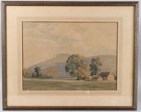 Downland view with farm buildings,
