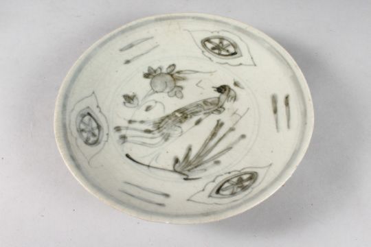 A CHINESE SHIPWRECK PORCELAIN DISH, with central bird and peach design.