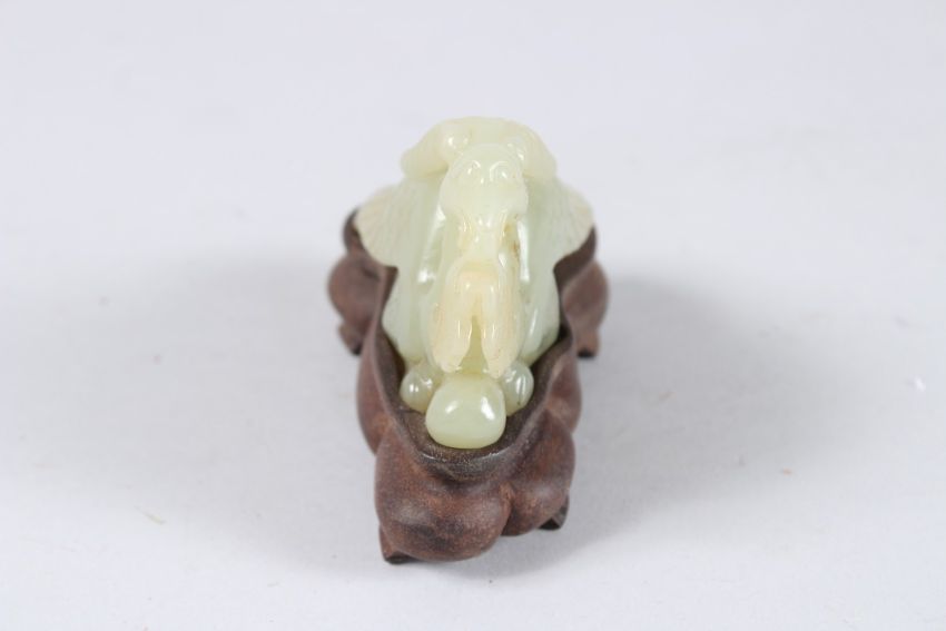 A 19TH CENTURY CHINESE JADE CARVING OF A PHOENIX, with hardwood stand.