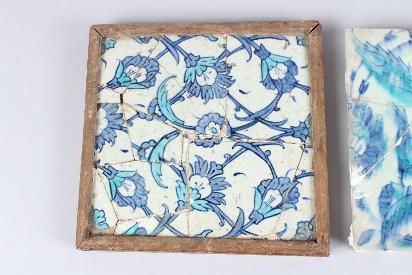 TWO 17TH CENTURY OTTOMAN IZNIK GLAZED POTTERY TILES (A/F).