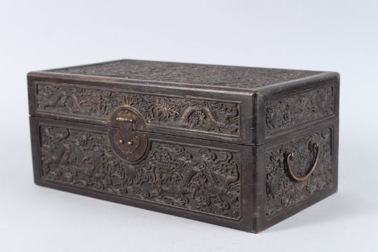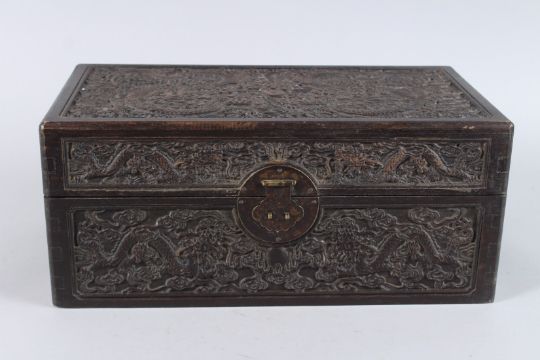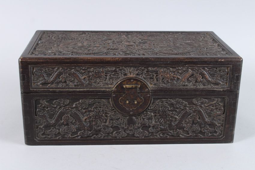 A CHINESE CARVED WOOD CASKET, with hinged cover, carved to the top, front and sides with dragons chasing the pearl of wisdom.