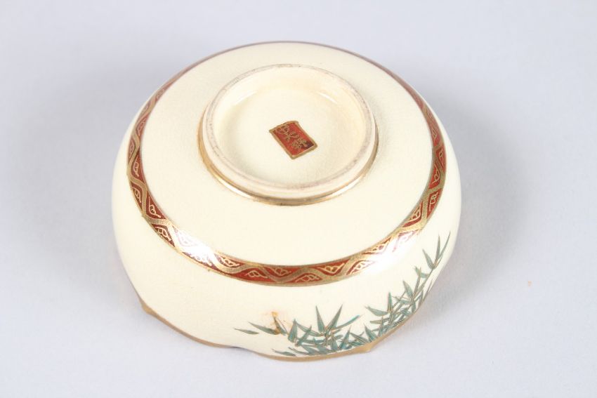 A JAPANESE SATSUMA CIRCULAR BOWL painted with birds, flowers and bamboo.