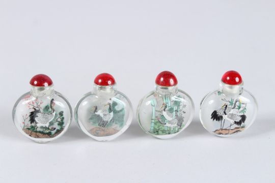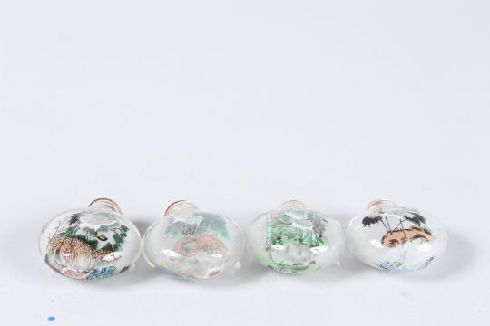 FOUR VARIOUS SNUFF BOTTLES AND STOPPERS.