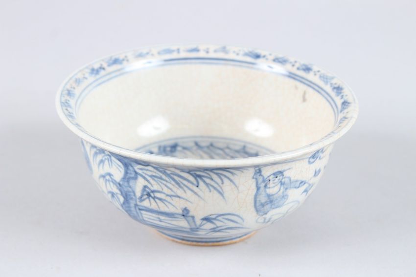 A SMALL CHINESE BLUE AND WHITE BOWL decorated with young boys.