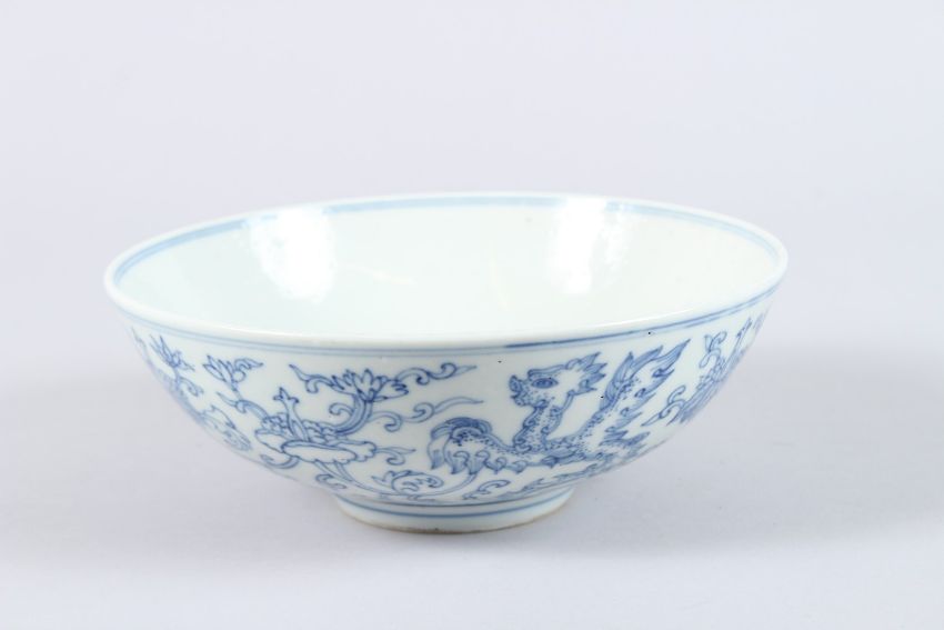 A CHINESE BLUE AND WHITE PORCELAIN BOWL, painted with a crane to the centre, dragons to the exterior, six character mark to the base.