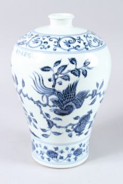 A CHINESE BLUE AND WHITE PHOENIX MEIPING VASE.