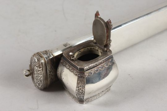 A FINE 19TH CENTURY OTTOMAN SIGNED WHITE METAL PENBOX, with inkwell, with two stamped signatures, 28cms long.