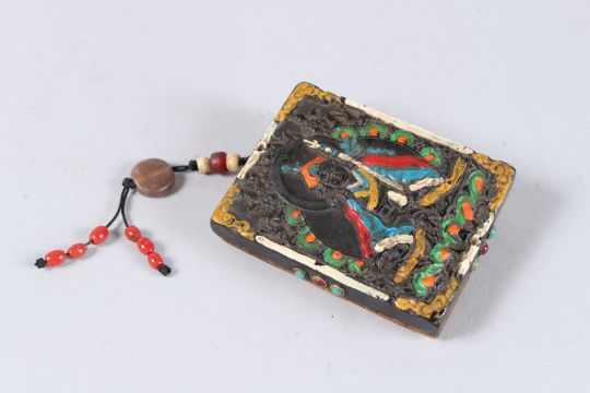 A TIBETAN BUDDHIST AMULET PENDANT featuring Padmasambhava (Guru Rinpoche) with "Tianzhu" agate and shell (such items are worn for protection and spiritual guidance in Tibetan Buddhism).