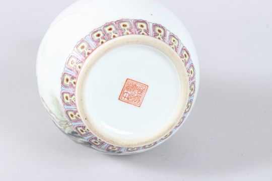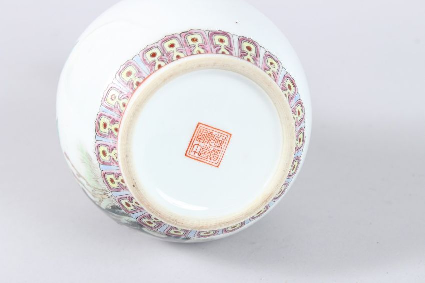 A CHINESE FAMILLE ROSE PORCELAIN BOTTLE VASE, painted with a peacock, flowering tree and calligraphy, red seal mark to the base.