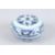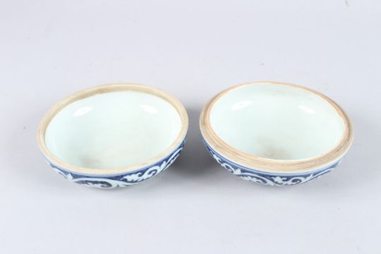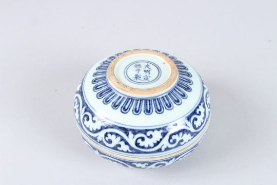 A CHINESE BLUE AND WHITE CIRCULAR BOWL AND COVER with leaf scrolls.