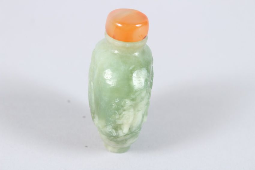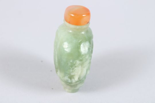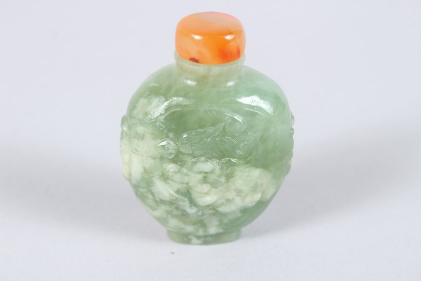 A CHINESE TWO COLOUR JADE SNUFF BOTTLE AND STOPPER, carved with dragons.