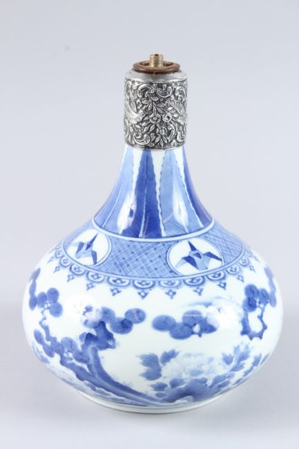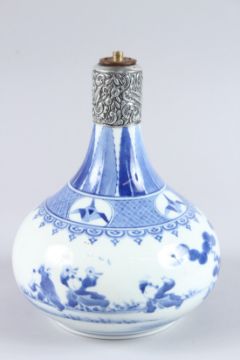 A CHINESE BLUE AND WHITE BOTTLE VASE converted to a lamp, with silver base.