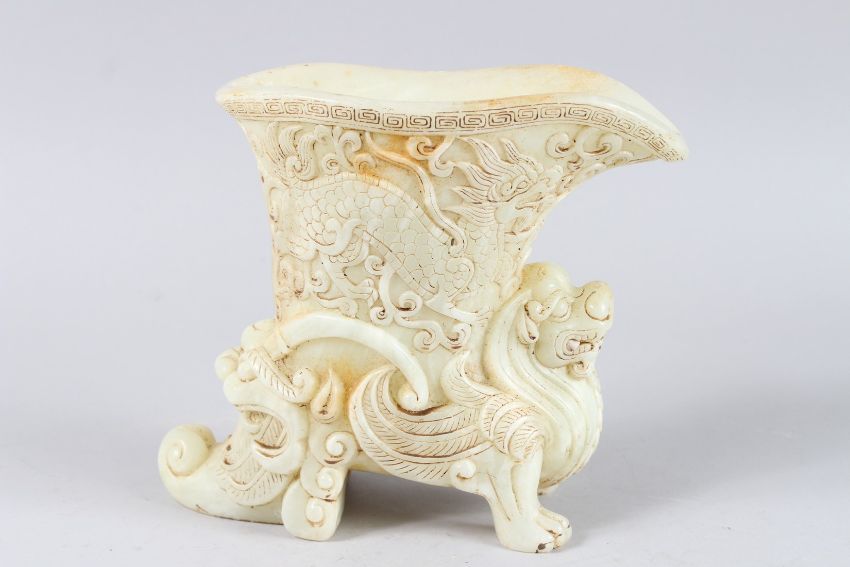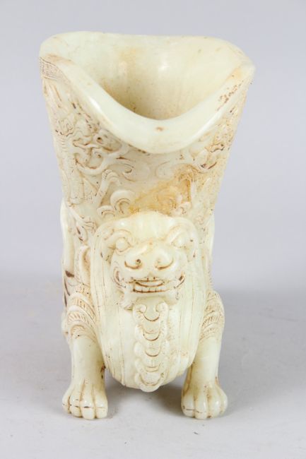 A GOOD WHITE JADE FOO DOG VESSEL.