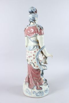 A GOOD LARGE CHINESE POTTERY FIGURE OF A STANDING BUDDHA, one arm to their side, the other holding a small bottle.