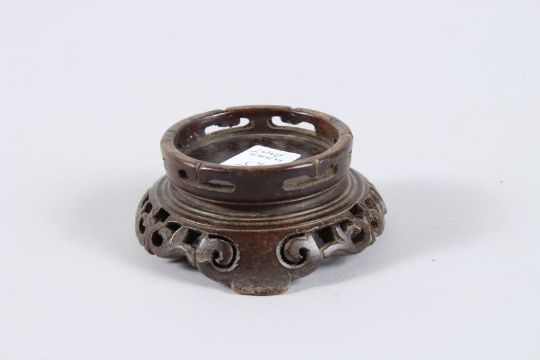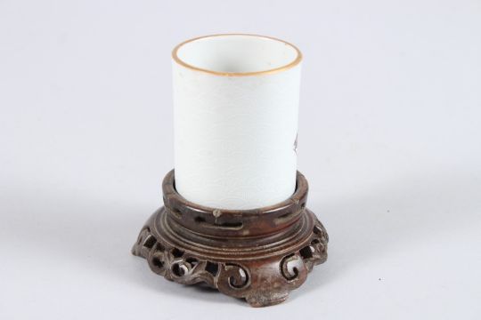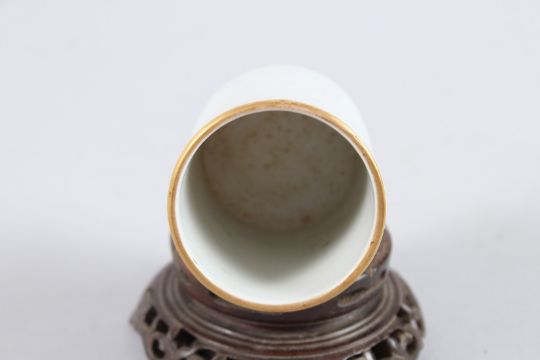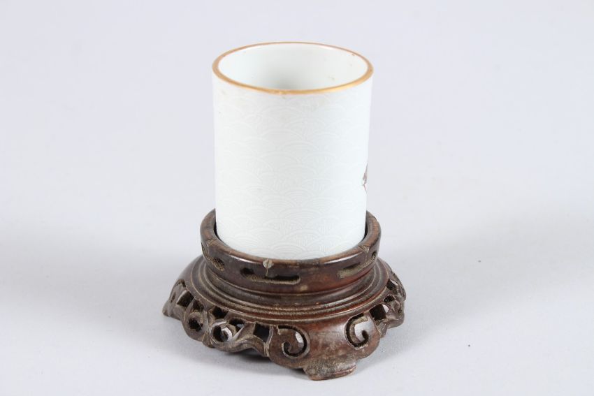 A GOOD SMALL CHINESE PORCELAIN SPILL VASE ON HARDWOOD STAND, the vase painted with a scholar on an ox, red seal mark to the base.